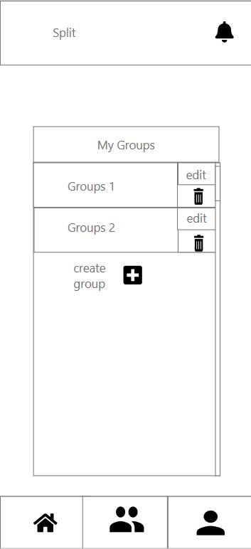 In the group tab, Users can see all the groups they currently belong to which gives them the option to leave one, edit one if permitted, or create a new group for a user’s new spilt payment. Essentially everything related to a group can be accessed from this tab. This was part of narrowing the main functions, and features that a user would want to access, to create easy-to-learn interfaces.