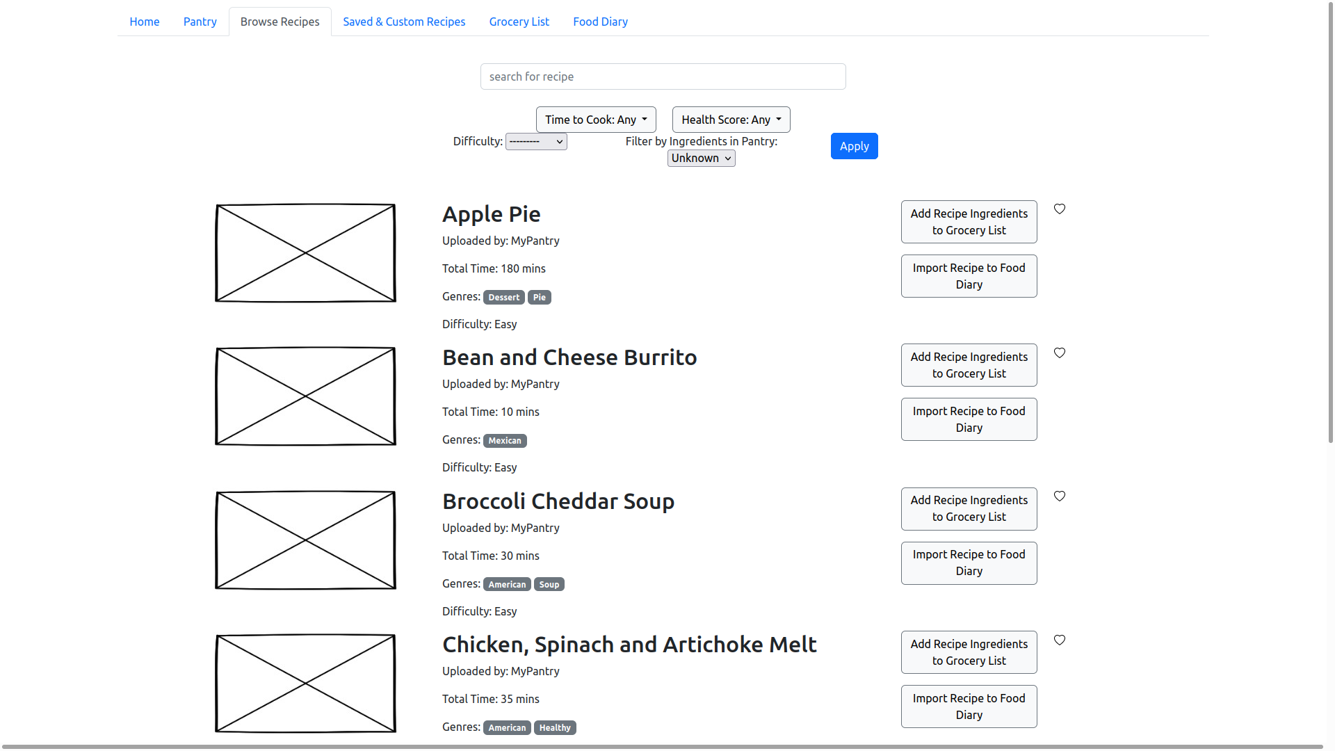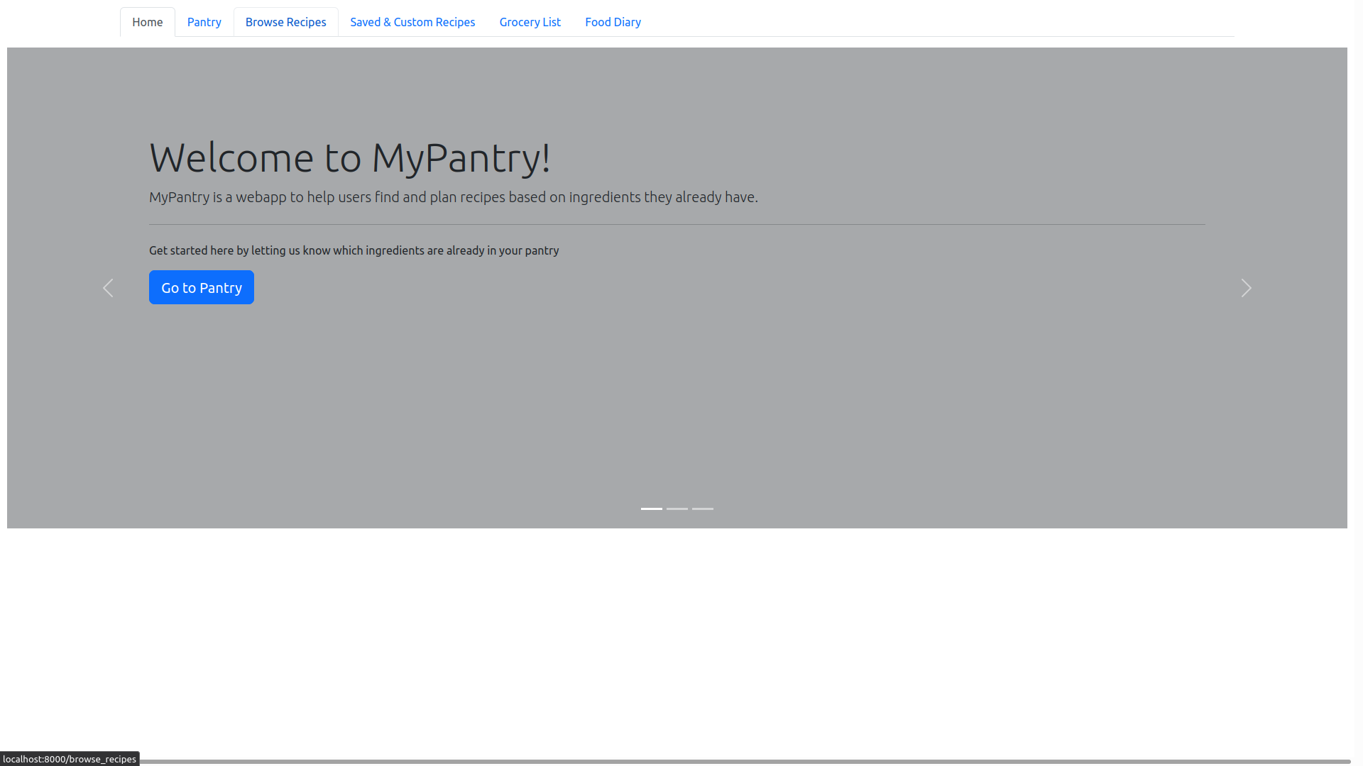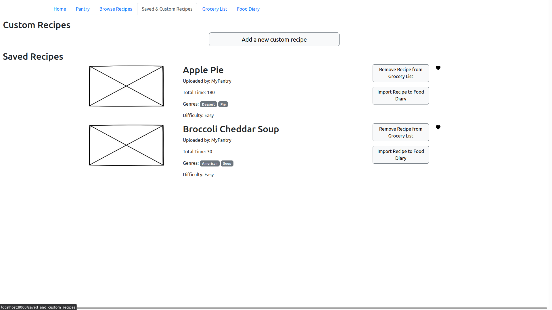 The MyPantry prototype used in the usability tests is a Django-based web application that was created by the UX team. We chose to use Django when making our prototype because we were not satisfied by the limitations on our insights that an AdobeXD prototype would have imposed. We believed that the best insights to be gained would be from user interactions with a “simulation” of the product.