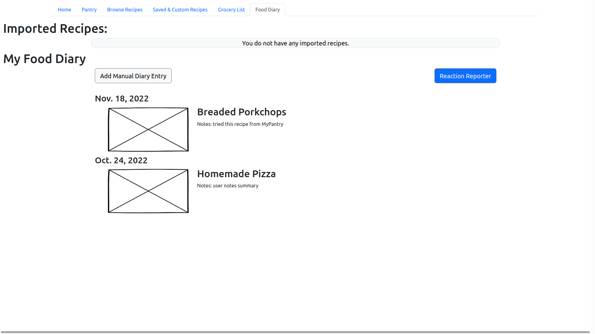 Moving forward, the food diary will be implemented as a timeline, where users add entries to the timeline saying that they either ate a specific recipe, or how they are currently feeling. It was also suggested that a program could analyze what you’ve eaten and how you felt, and determine ingredients or categories of ingredients you should try avoiding in order to improve your digestive health.