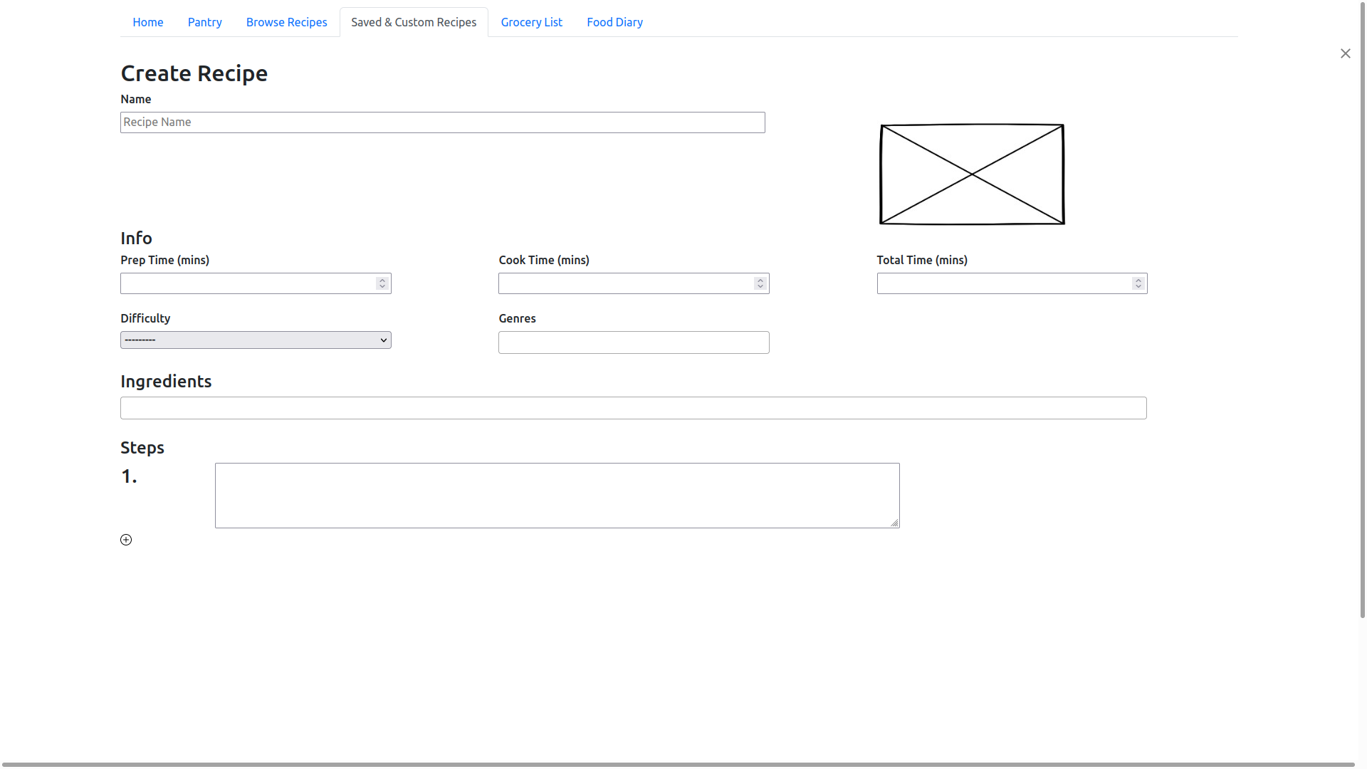 There are a few problems with our recipe creation form, one is that the button to add another step was too small, but this was more a limitation of the prototype rather than a design decision we actually made. A larger button is present in our wireframes. The same could be said for the position of the submit button, for some reason it was rendered lower on the page than where we actually would have liked it.