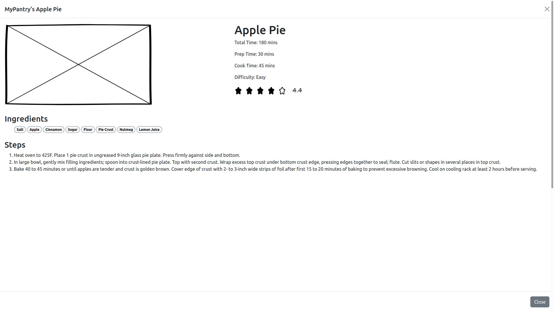 A lot of good feedback was recieved about the filters on this page. Clarity of the filters was questionable, as users were confused on whether the recipes were already filtered by the ingredients they had in their pantry. Part of this is due to a limitation of the prototype, as the dropdown for filtering recipes by ingredients should be a binary yes/no but for some reason renders as 3 options with the default being “unknown.”