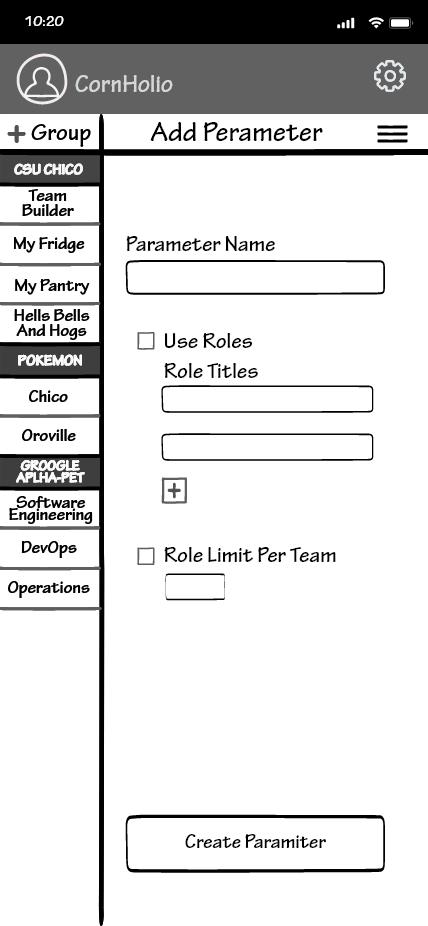 11. The create parameter page allows the user to add roles to the teams as well as give each role an individual title. There is also a check box that allows the user to limit how many of a particular role the user wants on a team. |