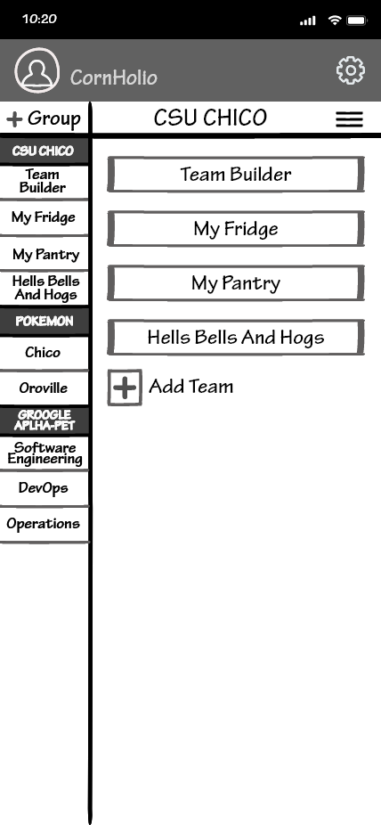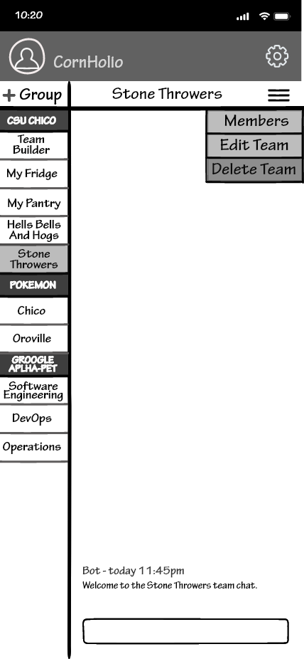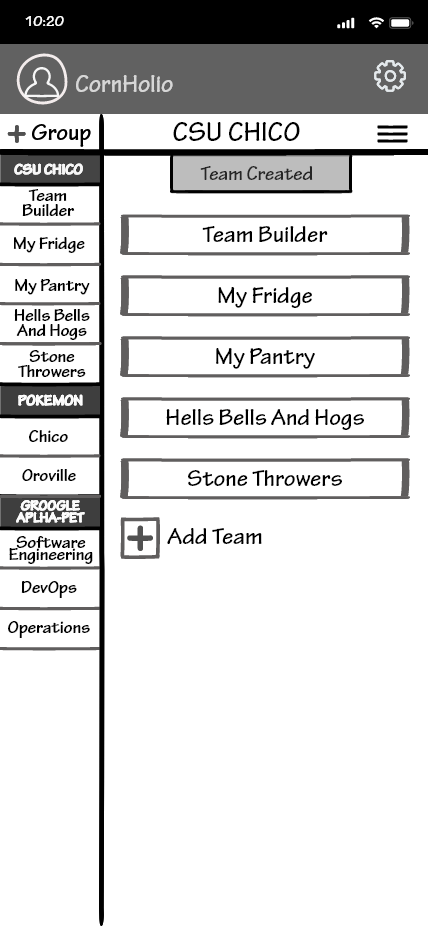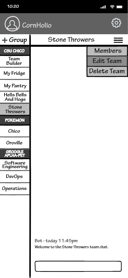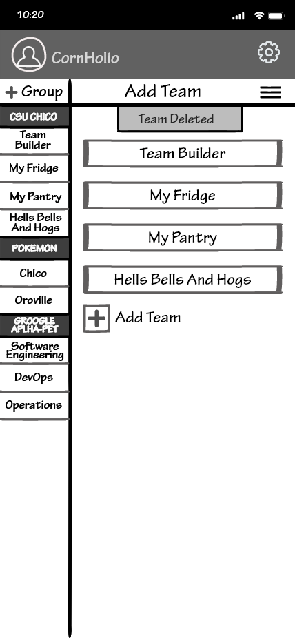 14. The hamburger in the corner (the three bars) provides a drop-down menu of which the user can choose to edit or delete a team. |