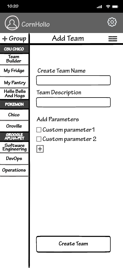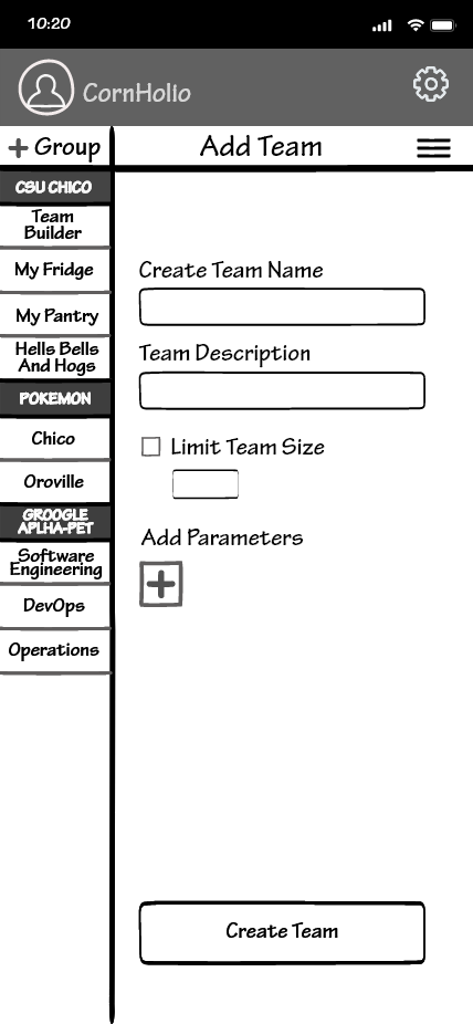 10. When adding a team to a group, the user is given the ability to name the team as well as give it a description. There is also a check box to limit team size, as well as a section to add various user-made parameters. |