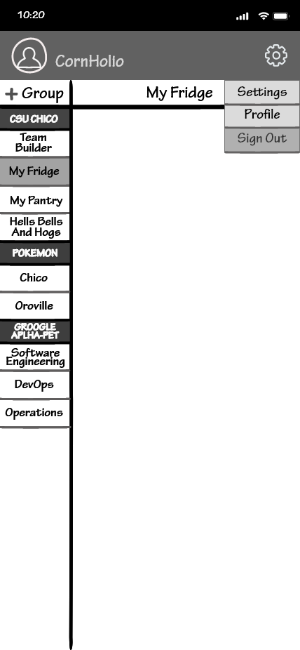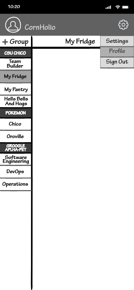 20. Tapping the gear in the top right corner of the screen will display a drop-down menu that allows the user to access general settings, the user profile, and the sign-out function. |