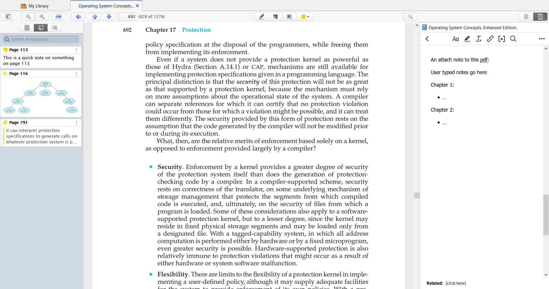 In the PDF reader, notes are placed on the right panel while annotations are placed on the left: